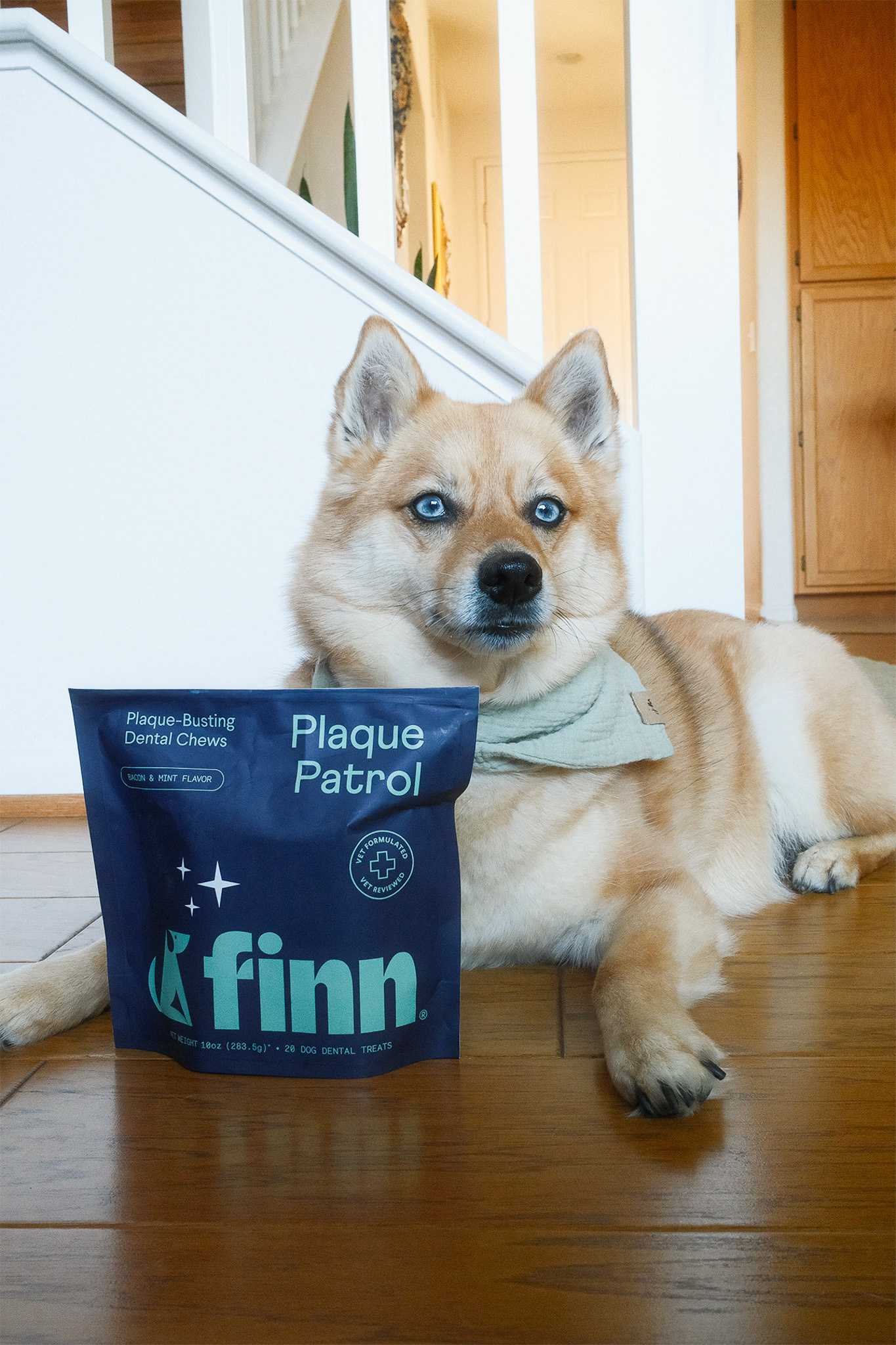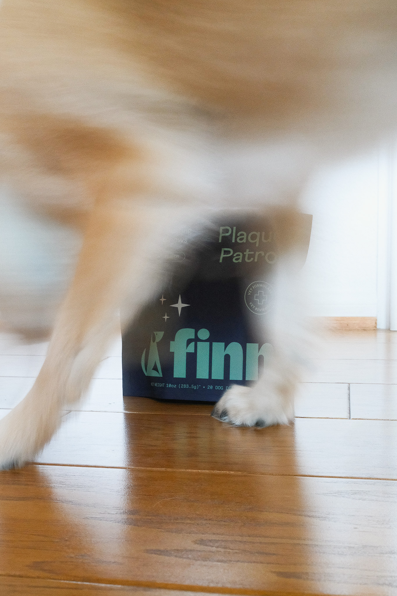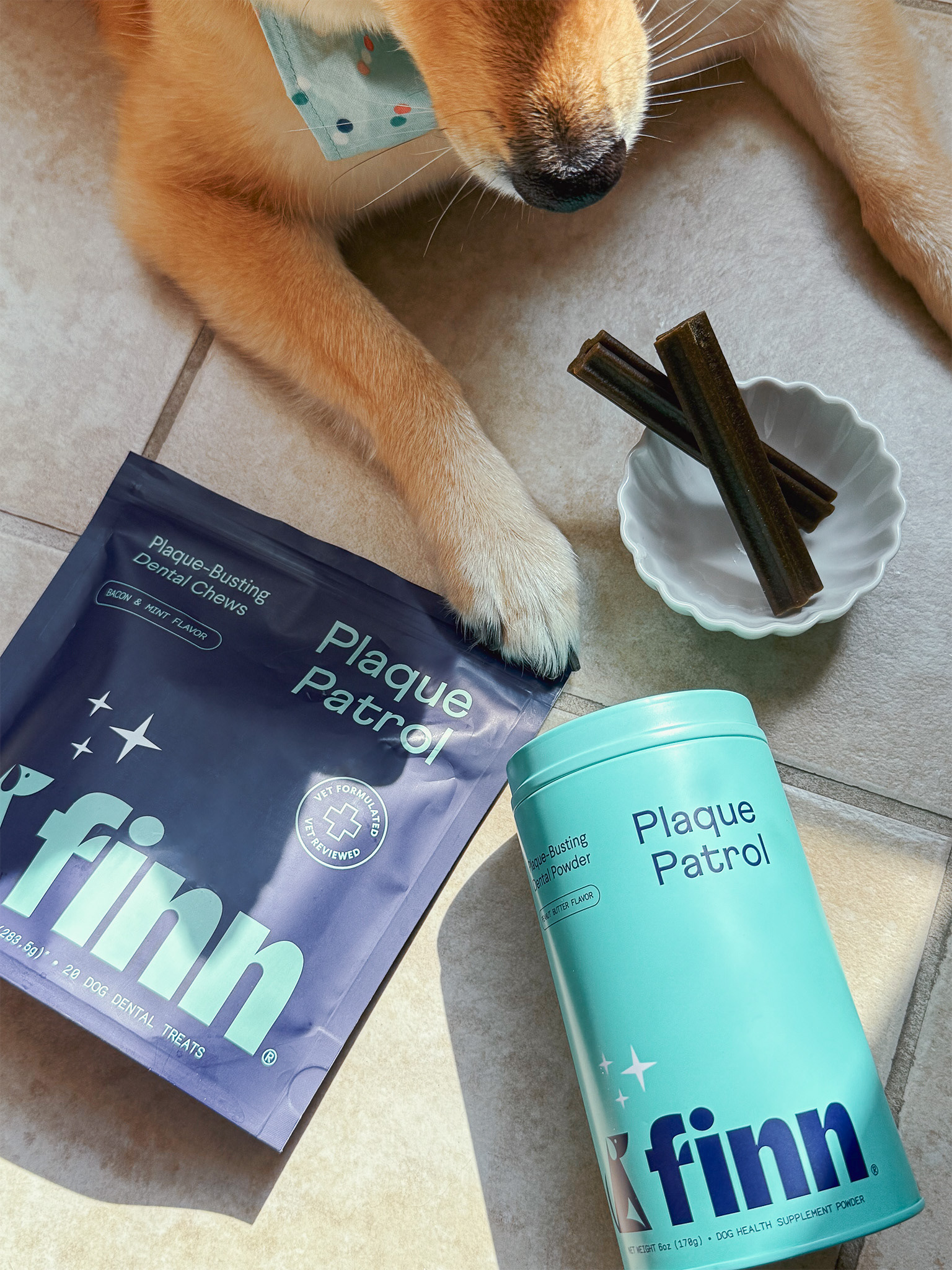 Goal: Deliver content that increases brand and product awareness for Finn's digital marketing and to show a demonstration of how easy and effective it is to use the Plaque-Busting dental chew with the powder together for their socials.